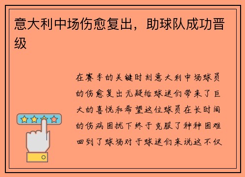 意大利中场球员的伤愈复出,不仅为球队的晋级之路增添了动力,也为球迷们带来了无尽的希望。无论是在技战术层面的表现,还是在团队凝聚力上的提升,他都证明了自己的价值。接下来的赛季,我们有理由相信,这名球员将继续引领球队走向辉煌。