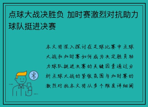 本文将深入探讨在足球比赛中,点球大战和加时赛如何成为决定胜负、助力球队挺进决赛的关键因素。通过分析点球大战的紧张氛围与加时赛的激烈对抗,本文将从多个维度详细阐述这些因素如何影响比赛结果,推动球队向最终的冠军目标迈进。首先,我们将回顾点球大战的决胜作用及其心理博弈,然后分析加时赛如何激发球员的拼搏精神,接着探讨教练战术部署和球员体能极限的挑战,最后,我们将通过具体的案例和实例,探讨这些因素在实际比赛中的重要性。通过这些层面的分析,读者将对点球大战和加时赛如何在决定最终胜者中发挥至关重要的作用有更深入的理解。