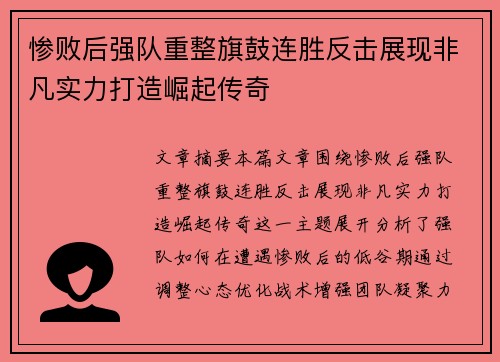 本篇文章围绕“惨败后强队重整旗鼓连胜反击展现非凡实力打造崛起传奇”这一主题展开,分析了强队如何在遭遇惨败后的低谷期,通过调整心态、优化战术、增强团队凝聚力和培养年轻力量等方式,成功实现自我重生,并在接下来的比赛中连胜反击,展现出非凡的实力,最终形成崛起传奇。文章从四个方面深入探讨了这一过程,包括:战术调整与应变能力、心理重建与团队凝聚、关键球员的表现和发挥、以及年轻球员的崛起与新血液的注入。每个方面都结合具体的案例和分析,揭示了成功复苏背后的深层次原因,并阐述了如何通过精准的战略和强大的意志力,克服重重困难,实现球队的崛起与壮大。最终,文章总结了强队如何通过逆境中的自我重整,演绎出一段充满传奇色彩的成功故事。